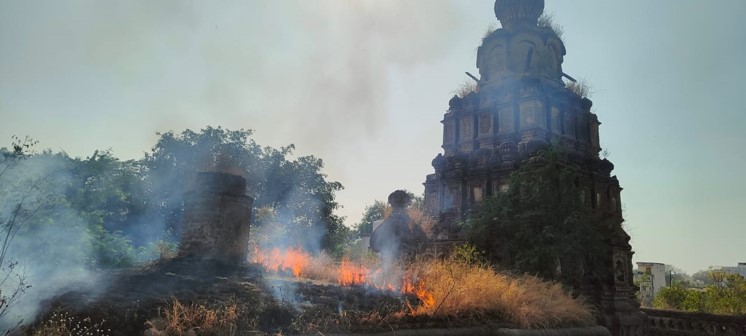 One such temple is the Siddheśvar temple, built in 1706 CE by the Phadnavis who were Maratha Sardars of the region. It is the largest temple and arguably the most beautiful among the group of Śiva temples at Talegaon Dhamdhere. Its structure along with the sculpture on the śikhara of the temple is still intact. However, it was overgrown with weeds, plants and in some cases, the roots penetrated into the structure of the temple. Moreover, the water was seeping from the roof into the garbhagṛha which will eventually compromise the structural integrity of the temple. Further, the śikhara of the temple needs urgent renovation based on sound conservation principles.
