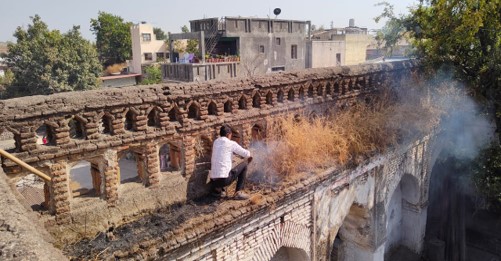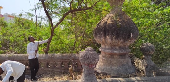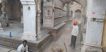 Repair work of the Temple: Led by Vijay Sarde, the team at Tattva Heritage Foundation has made multiple visits to the temple, and earlier this year we tentatively began the first phase of the restoration process. We hired multiple labourers, contractors and cleaners to work on removing the very dense outgrowth of plants, shrubs and weeds across the temple structure including on the temple śikharas. This time-consuming work took more than a week to be accomplished, and now the temple premises look clean and most of the tree roots that were causing structural damage to the temple have been removed. In certain cases, these roots had penetrated so deep inside the temple structure that specialist labourers were called to undertake this task. Currently, we are undertaking some structural repairs which will stop the seepage of rainwater into the garbhagṛha.