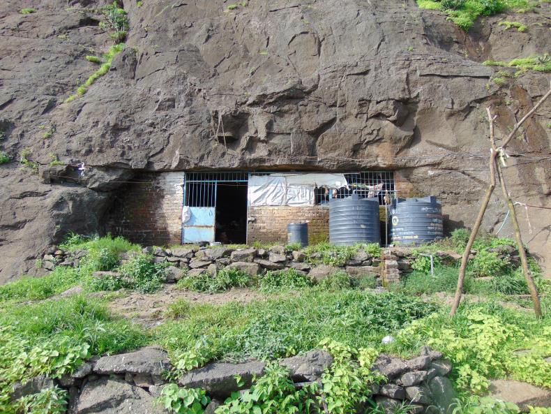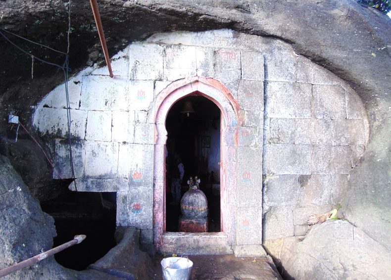 Cave Nos. 2 and 3 are located at a short distance from Cave No. 1 and appear to have been recently expanded. Inside is a spacious hall where members of the Vārakarī sect are currently residing. A collection of sculptures, including one of Bālakṛṣṇa, is kept under a tree outside this cave nearby. A samādhī stone is also present at this site. From the initial cave, two paths diverge. One leads to a third cave, which is simple and lacks notable architectural features. Carved steps facilitate the mountain ascent. Climbing further reveals a natural cave atop a hill known as Bhāgiratha Kuṇḍa. This location is thought to have connections to the Rāmāyaṇa and may be associated with Yonī-pūjā.