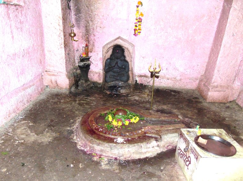 One can directly go to the garbhagṛha from the sabhāmaṇḍapa. The doorway to the garbhagṛha is attractive and has pillar branches. Śaiva Gatekeepers are carved under these branches. The Udumbara has a gem (Ratna) design in the center and has kīrtimukhas on either side. There is an image of Gaṇeśa on the lalātapaṭṭī. Apart from this, Mālādhārīs, Devī, and other images are seen in the doorway. In the center of the garbhagṛha is a Śivaliṅga. Behind the Śivaliṅga is carved an idol of a devotee or yogi in Añjalī Mudrā and Padmāsana. There is also an attractive lotus flower on the roof of the garbhagṛha. Unnecessary paintwork has been done on all parts of the temple. This entire temple is carved in stone, and from its architectural style, it seems to be around the 15th century.