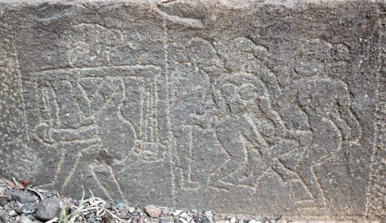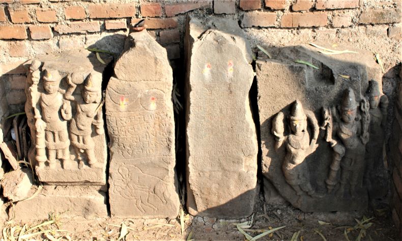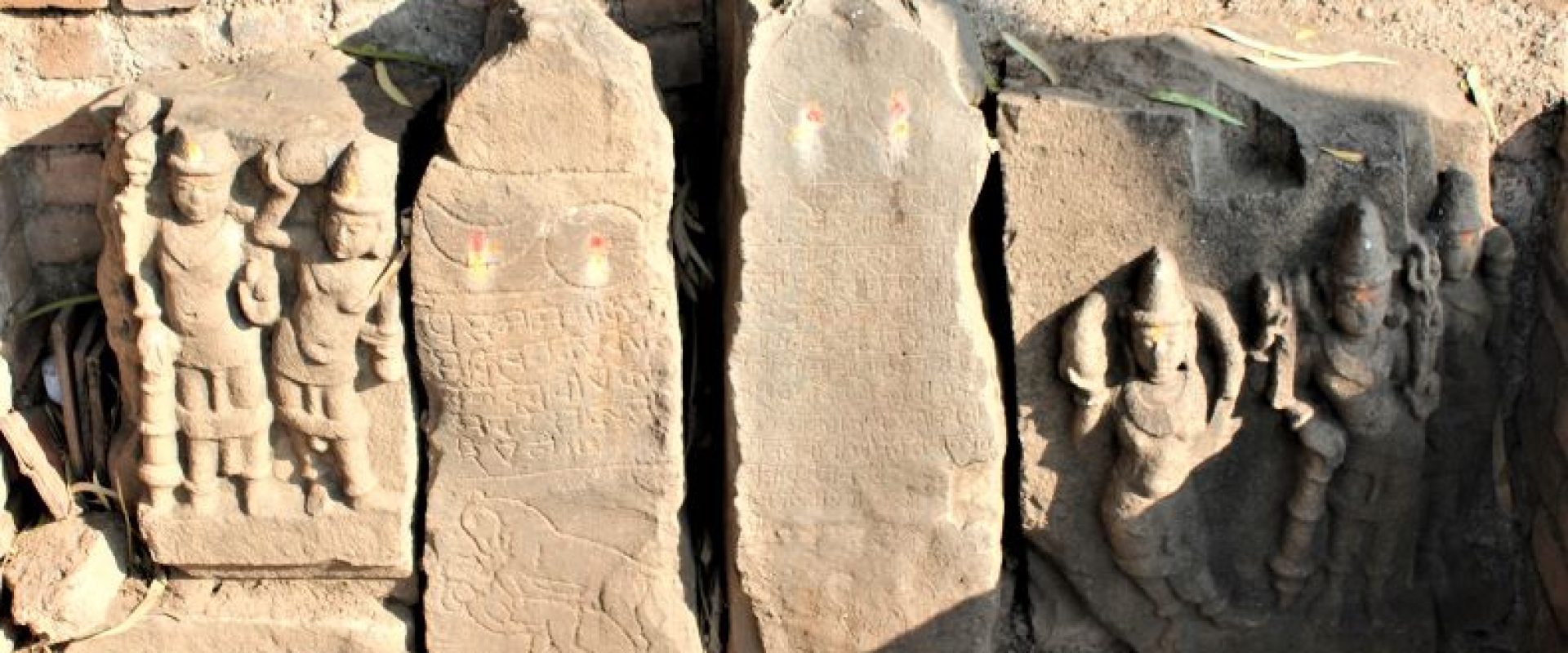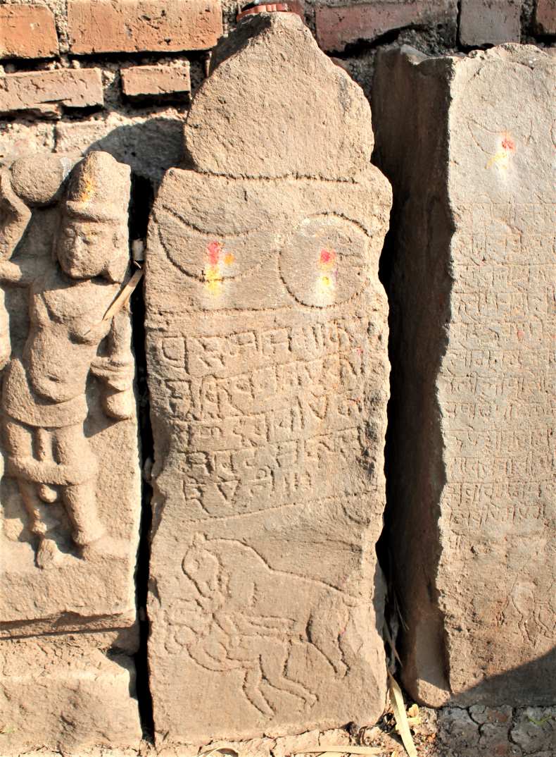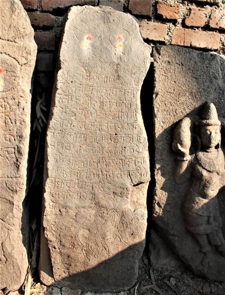 Inscription No. 1 (18.563171, 74.373536): The Mahādeva temple has two stone slabs with inscriptions, known as 'Gadhegaḷa' (ass cursed stele) due to the markings of a donkey and woman on them. One of the inscriptions belongs to the reign of Muhammad Tughlaq, with 13 lines in total and a carving of the moon on the right and the sun on the left. The inscription ends with depicting a donkey and a woman having intercourse. However, much of the central portion of the inscription has become obscure and difficult to read due to the effects of sun, wind, rain, and human interference. Despite a careful attempt to read the inscription, some errors may occur in reading the letters engraved on rough surfaces.
