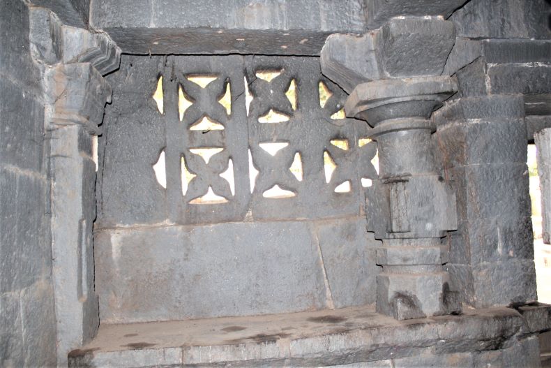 Sabhāmaṇḍapa: There are two niches outside the sabhāmaṇḍapa on either side, and specific jālawātāyanas (gavākṣa) with leaf-shaped carvings are made on both sides of the entrance for light arrangement into the sabhāmaṇḍapa. The door of the maṇḍapa appears to have been changed at some point, as part of the original door can be seen outside the temple beside the inscriptions. Although some fragmented sculptures are still visible in front of the temple, it is clear that some portion of the original temple must have been removed. At the entrance of the sabhāmaṇḍapa, there is a sculpture of Gaṇeśa. Two kakṣāsanas with 2-2 ardhastambhas are on either side of the doorway. The interior of the sabhāmaṇḍapa measures 590cm in length and 655cm in width. Additionally, the part of raṅgaśiḷā inside the catuṣkī is 327cm long and 345cm wide. The sabhāmaṇḍapa has four main stambhas (catuṣkī) and 12 ardhasthambas, with the height of the pillars (from the stambhaśīrṣas) at 245cm.