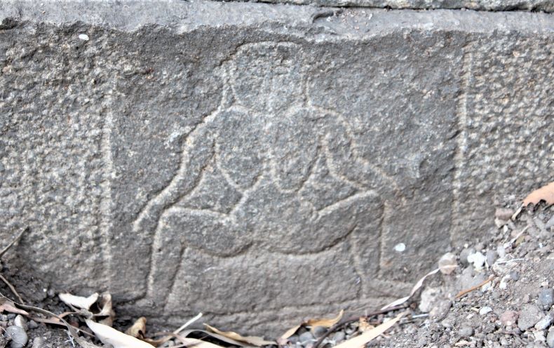 Temple Exterior: The Mahādeva temple lacks a distinctive carving on its exterior, but there are some engravings on the right corner of the sabhāmaṇḍapa. There are some carvings on the outer wall of the upagarbhagṛha on the right side, including a depiction of a woman portrayed as a Lajjāgaurī and a man shown tying his penis and testicles with a rope and weighing them on his shoulders. Another drawing shows a scene of a union between a woman and two men.