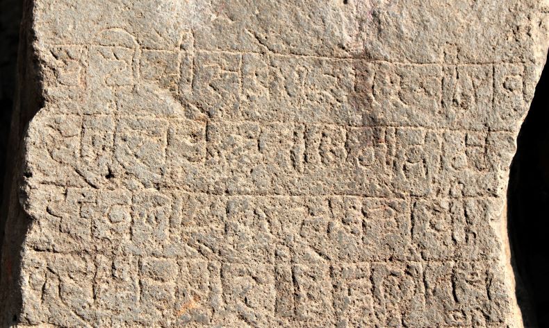 Style of letters, writing system, language, and period: This inscription is written in the Marathi language and in Devanāgarī script, reflecting the writing style of the Yādava period. The stone slab on which it is engraved appears to have been smoothed before, and although the letters are small, they are still clear. However, some words have been miswritten, and some letters bear the nasal vowel marker of the Devanāgarī script. The inscription explicitly mentions the year as 'Svastī śrī śake 1251, Vibhava samvatsare', but the month, day, and tithi are not specified. The Indian months of Māgha, Phālgun, and Caitra fall within the Gregorian months from January to March 1329 CE, according to Pillai Jantrī.