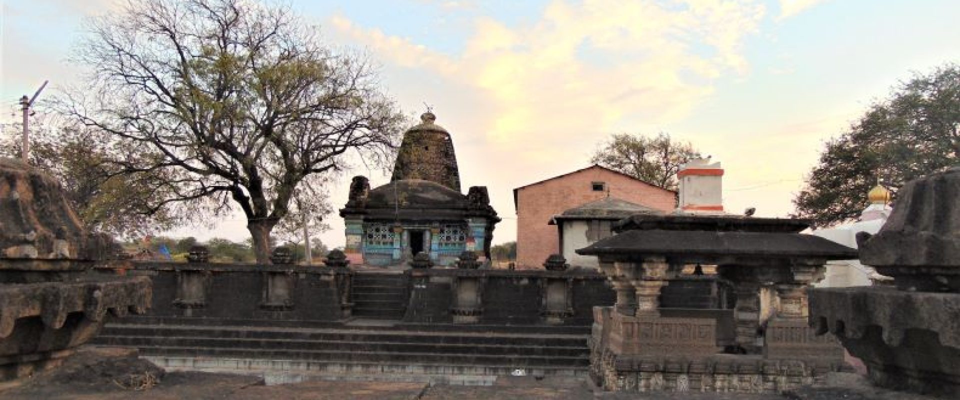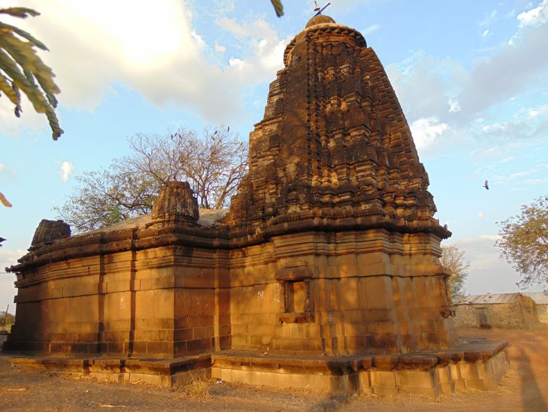 Śikhara: The temple's superstructure follows the Bhūmija style, characterized by its four bhūmīs (tiers) and five projections (pañca-rathas). Within a prominent gable arched window (Śurasenaka) are intricately designed vine patterns (Latā) and a sculptured medallion. A Gaṇḍa-bheruṇḍa bird image, crafted from stucco, adorns the Śurasenaka. Atop the superstructure, an Āmalaka (a serrated, large, flat ring) and Kalaśa (finial) are discernible. The superstructure's facade features a damaged Śurasenaka (gable arched window). The covering atop the gūḍhamaṇḍapa has flattened over time and is possibly of the Phāṃsanā style. Each of the four corners is graced by a small Kūṭa superstructure (Kūṭa-śikhara), which is constructed from bricks. Probably there was a fortification wall around the temple. At present, it is not there. there are no lamp pillars in front of the temple however; there is a pillar in front of the stepped well. Similar pillars are found in front of Śiva temple in Parli, Satara district, and Nāgeśvara temple in Pabal, Pune district.