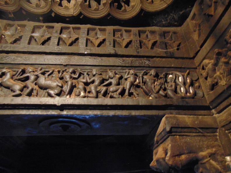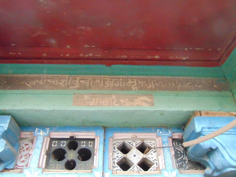 Inscription: There are two painted inscriptions on the frontal beam of gūḍhamaṇḍapa. One inscription on the above mentions the name ‘Jogī’ and the inscription below mentions the name of the Nāthayogī –‘Cāṇgā Vaṭeśvara.’ The inscription is in Devanāgarī script and Marathi. It has two lines. These inscriptions possibly belong to the 14th-15th century CE.