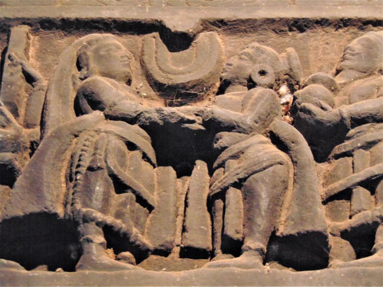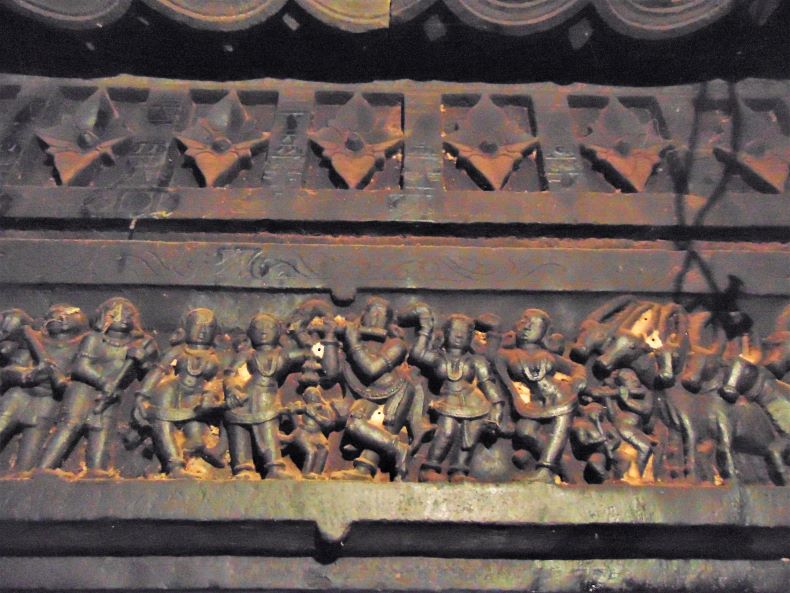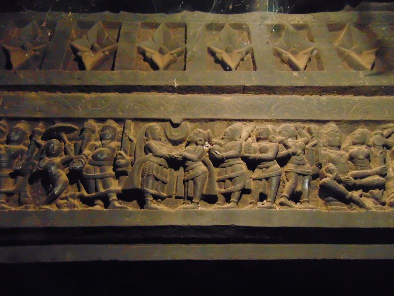 Kṛṣṇa-Līlās: The most striking sculptural panels depict the Kṛṣṇa-Līlā and are prominently displayed on the beams of the raṅgaśiḷā. These panels, which narrate tales of Kṛṣṇa-Līlā, were identified by Mr. Gopal Joge from Deccan College, Pune. They showcase various scenes sourced from the Bhāgavata and Harivaṃśa-Purāṇa. On the south beam, the tableau illustrates Vāsudeva's marriage to Devakī, attended by various deities. To the right of this depiction, figures include Sūrya, a chauri-bearer, Indra, Viṣṇu, Vāmana, and Brahmadeva, among others. To its left, potential representations are Devakī's mother, another chauri-bearer, Gaurī-hara pots, Sarasvatī, a maid, and Gaṇapatī.