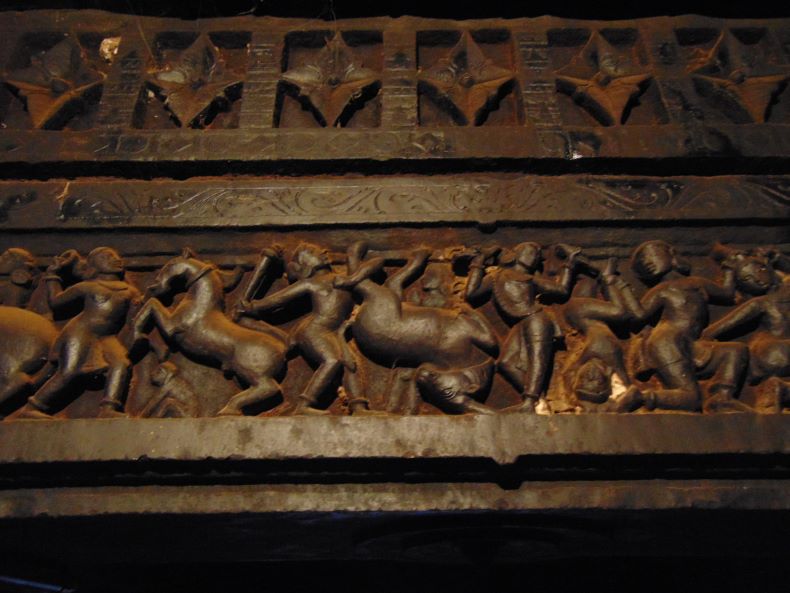 Twelve pillars, each crowned with Bhāravāhaka Yakṣa carvings, support the gūḍhamaṇḍapa. The primary square sections of these pillars vividly depict wrestling bouts, the Kāliyāmardana scene, and vignettes from the Rāmāyaṇa, such as Sītā offering alms to Rāvana, the demise of Mārica (image below), and scenes featuring Rāma, Lakṣmaṇa, and Mārutiī. Notably, there's the Aśokavāṭikā Mārutī depiction, showcasing Mārutī in Aśokavāṭikā, and the fierce battle with demons. Further enriching the visual experience are scenes of elephant battles, singers, musicians, Gandharvas, peacocks, swans, and kīrtīmukhas. Another entrance door to the gūḍhamaṇḍapa can be found on the eastern side. The west wall of gūḍhamaṇḍapa is leaning outward and might collapse if not attended in time. It needs to be conserved as soon as possible.