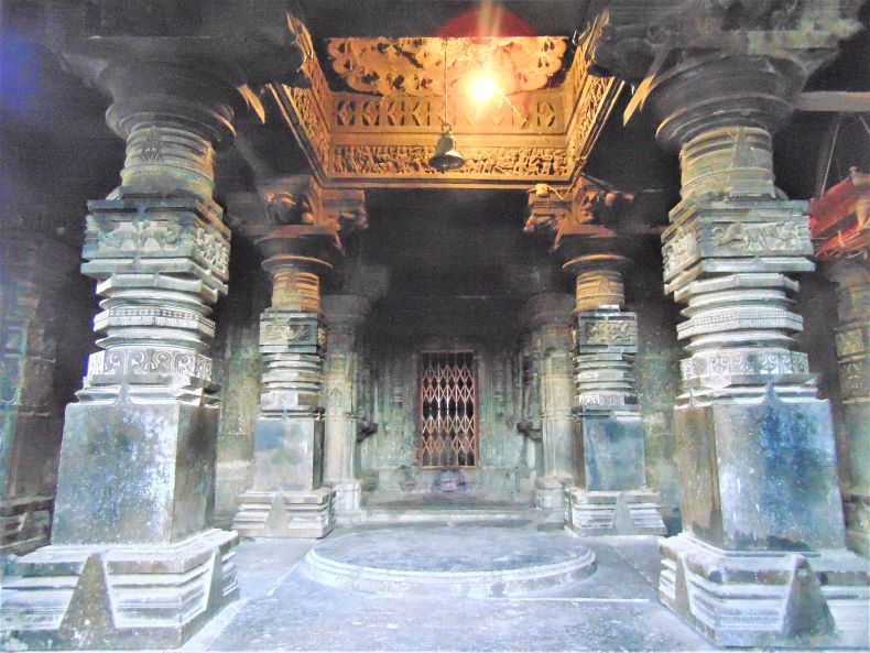 Maṇḍapa of the Dattātreya Temple: However it is the maṇḍapa preceding this temple is a marvel of beauty. Its half-pillars are intricately carved, crowned with inverted cobras. The maṇḍapa has two entrances, one facing east and the other west, and it features an elegant lotus design on the ceiling. Within the maṇḍapa, one can observe well-crafted seating arrangements, with benches adorned by various sculptures on their outer sides. Along the ambulatory passage, these benches showcase an array of sculptures, including depictions of couples, musicians, dancers, and more.