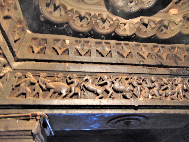 Gūḍhamaṇḍapa: The entrance doorjamb of the gūḍhamaṇḍapa boasts five intricate branches: Vine, Figurine, Pillar, Foliage, and Vyāḷa, the latter being referred to as 'Nandinī.' Within the Figurine branch, carvings of musicians can be found. The lintel prominently features a carving of Gaṇapatī. Below the door-jamb branches, one can discern the figures of Gaṅgā-Yamunā, Dvārapālas, whisk-bearers, and treasurers. Flanking the entrance are finely enmeshed windows.The interior of the gūḍhamaṇḍapa is of the Navaraṅga type, complete with seating arrangements known as kakāsana. These seats are adorned with images of Hanumāna and Yakṣa-like figures. Above the windows, a plethora of designs—floral patterns, kīrtīmukhas, elephants, Śarabhas, swans, and vines—add depth and beauty, while the lower part focuses on floral, swan, and vine patterns. Dominating the center of the gūḍhamaṇḍapa stands a Raṅgaśilā, a circular stone slab, surrounded by four pillars. The beams of the Raṅgaśilā has stunning carving of Kṛṣṇa-Līlā scenes, probably the best in Pune district.