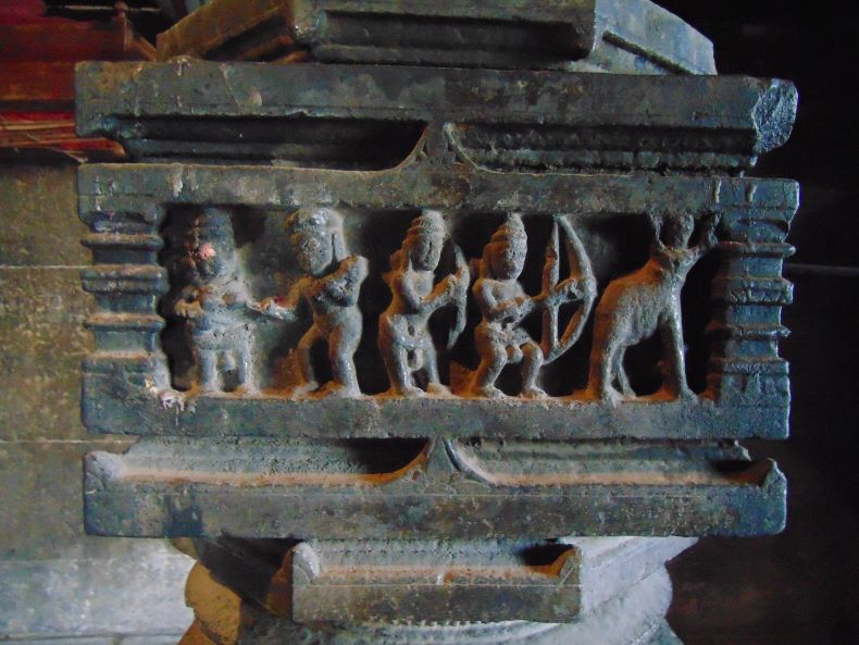 Rāmāyaṇa scene on the pillar of gūḍhamaṇḍapa: Sītā giving alms to Rāvana, and the killing of Mārica
