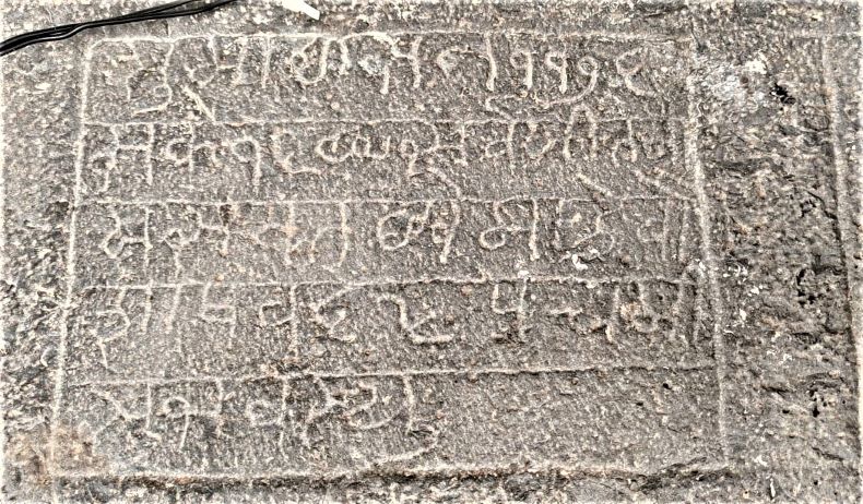 Inscription: An inscription in the Marathi language written in Devanāgarī script, carved above the door of the Pāṇḍuraṅga temple’s garbhagṛha (18.742768, 74.098945), commemorates the temple's construction with two parts measuring 31 cm tall and 18.5 cm wide.