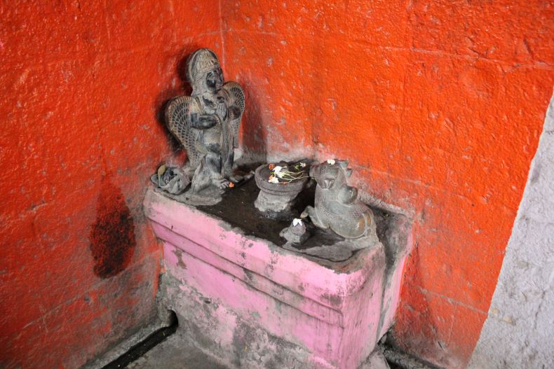 There are two niches on the left and right sides of the garbhagṛha. A Gaṇeśa sculpture is on the lalāṭapaṭṭa of the arched entrance to the garbhagṛha. The vitāna of the garbhagṛha tapers upwards, and a bell is hung in this area. The door of the garbhagṛha is made of wood, and due to its design, it appears to be quite old. There is a kīrtīmukha on the threshold that resembles a human face. A total of 16 ardhastambhas, four on each side, and a total of eight niches, two on each side of the garbhagṛha's exterior, can be found. A kūrmaśilpa is present in the maṇḍapa in front of the garbhagṛha.