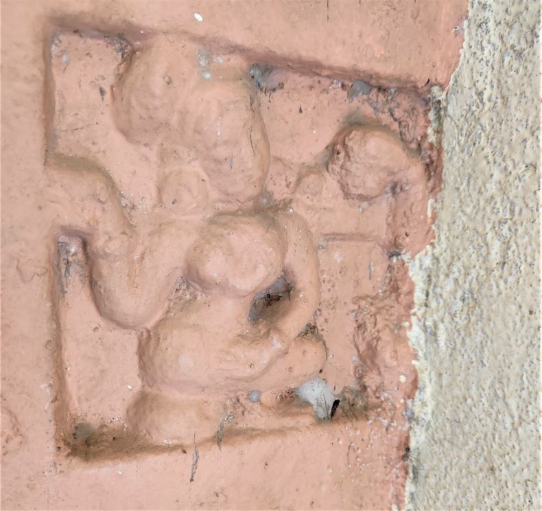 On the western side, a pun-in-sculpture and a human figure with three legs is carved.