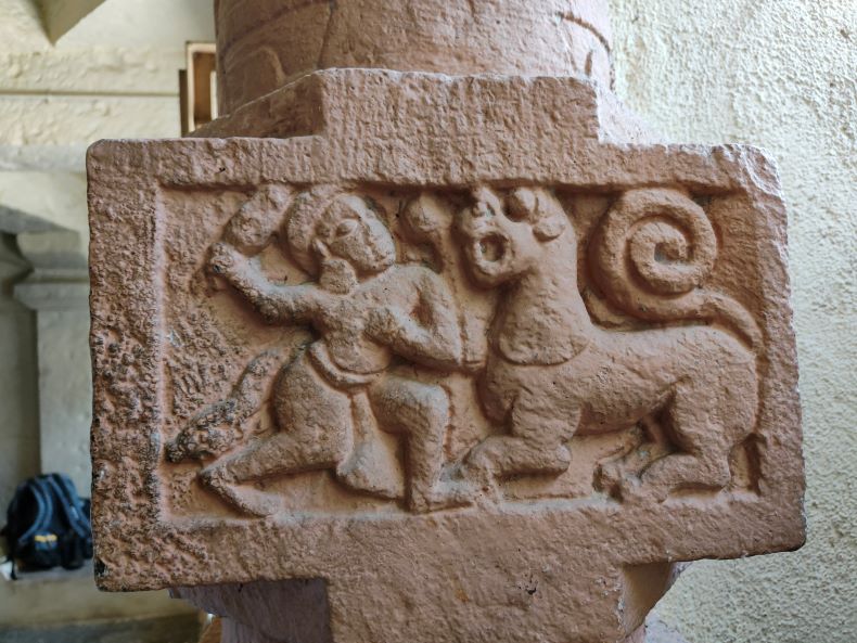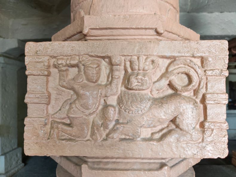 Sculptures in the gūḍhamaṇḍapa – Pillar 2: A fight between a man and Śarabha is carved on the east on the central part of the pillar, a person seated on Makara (crocodile) is carved on the south, a dancing girl accompanied by two musicians is on the west.