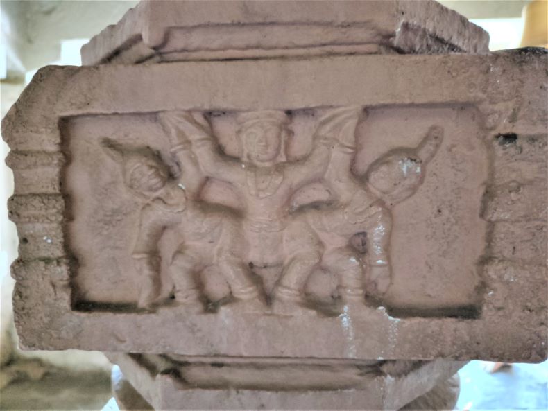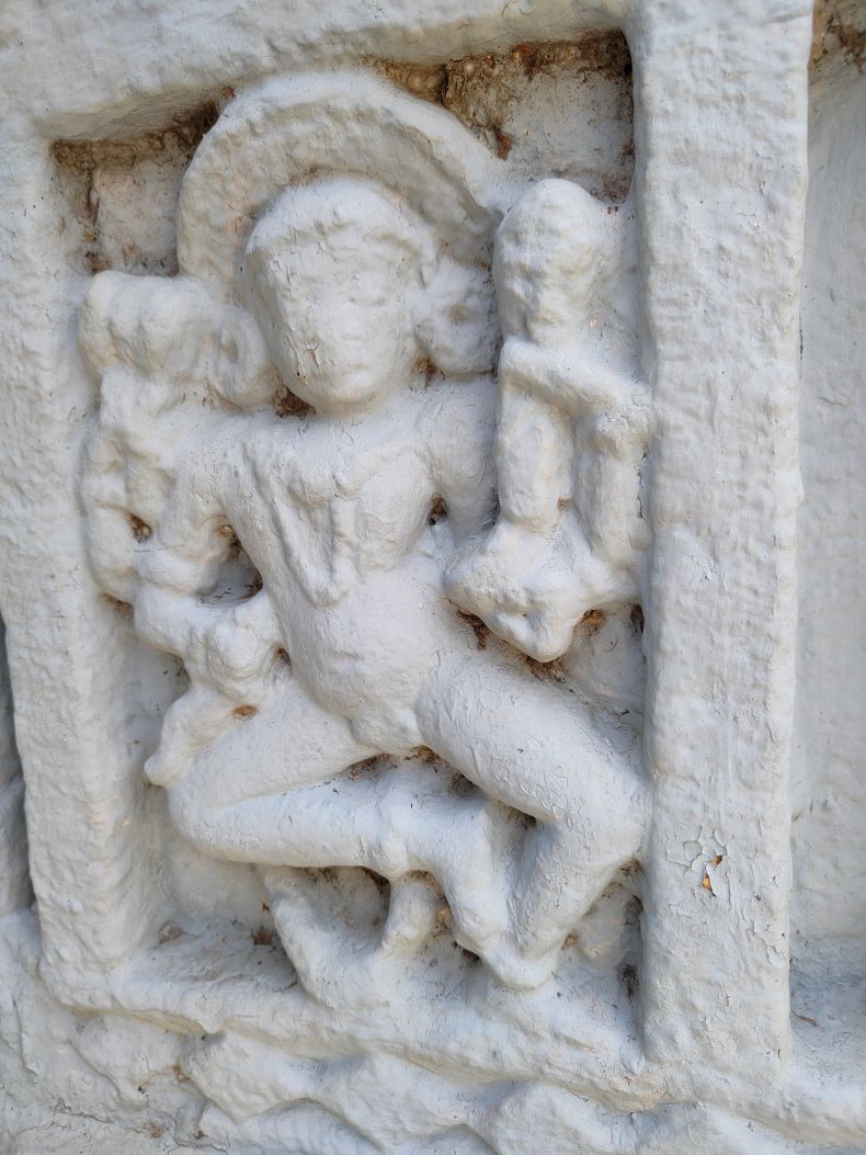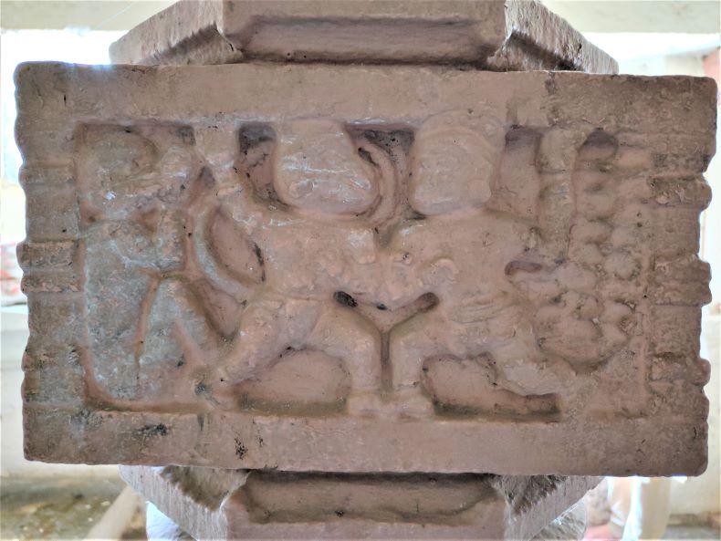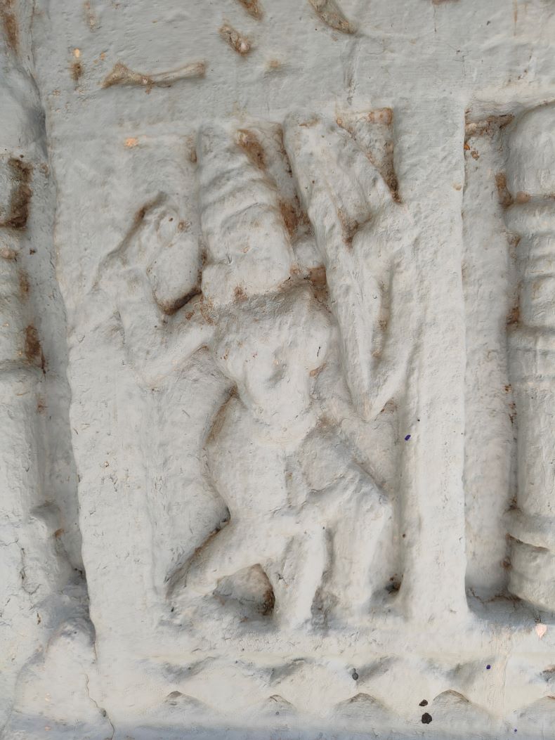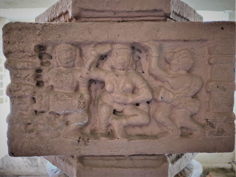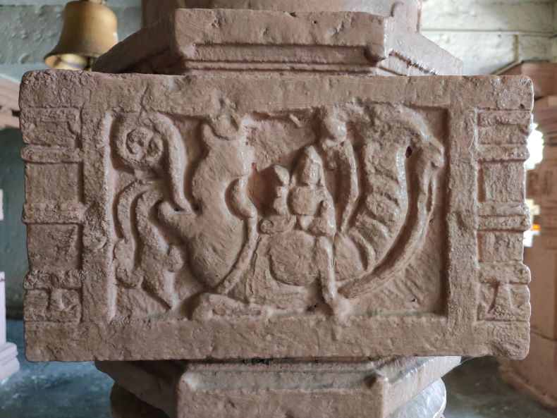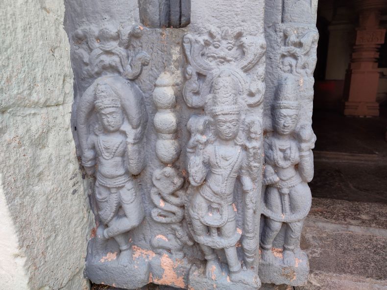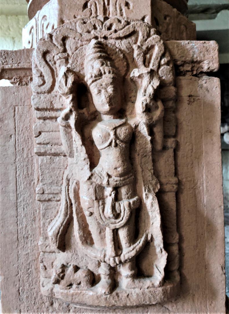 Iconographic description: There are some sculptures in and outside the temple. Some sculptures are carved on the four pillars in the gūḍhamaṇḍapa. The part of kakṣāsana bearing sculptures has recently been covered with some intrusive construction. Below are all the sculptures on the two dwarf pillars and the 4 main pillars of the gūḍhamaṇḍapa.
