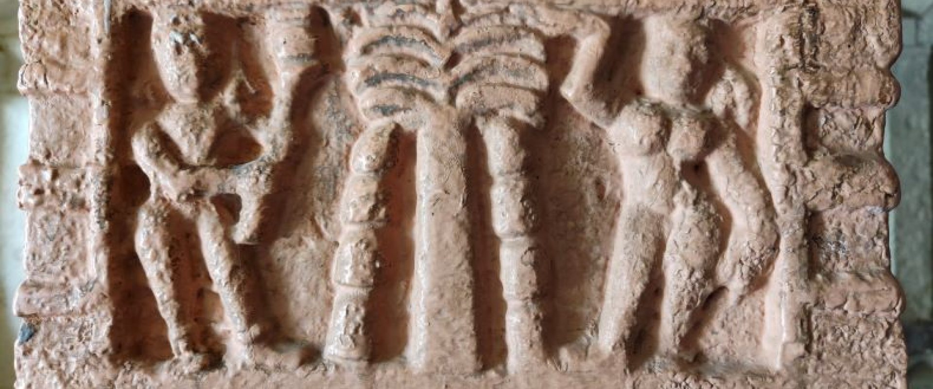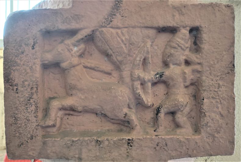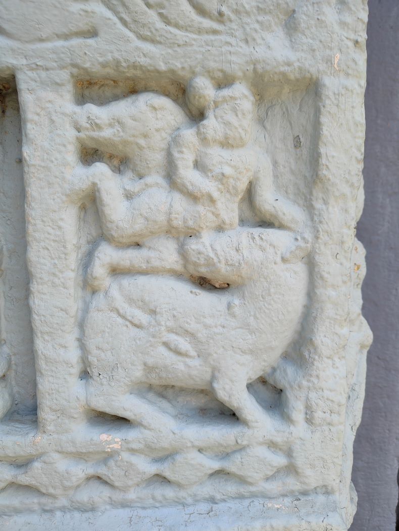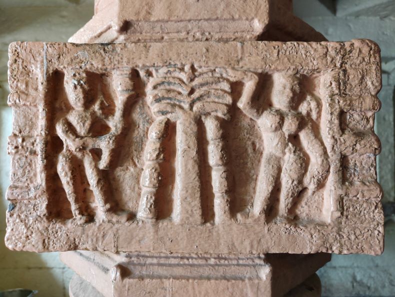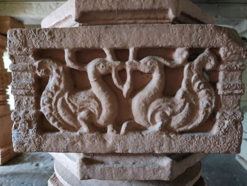 The sculptures on the dwarf pillar from kakṣāsana (north): On the dwarf-pillar 1, the killing of Mārīca, the meetings of Sītā and Hanumāna, Rāma and Bhārata are carved. On the dwarf-pillar 2, a kīrtīmukha, Kṛṣṇa with cattle, Śarabha, and a club-fight scene between two men are carved