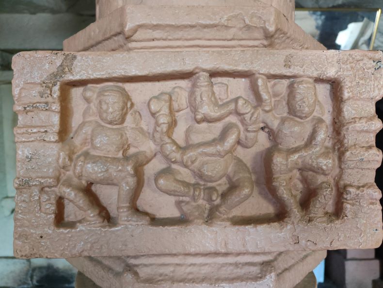 Sculptures in the gūḍhamaṇḍapa – Pillar 1: On the central part of the pillar, a kīrtīmukha is carved on the eastern side, a Kṛṣṇalīlā is carved on the south and a dancing girl is carved on the same side, on the lower part of the pillar. On the western side of the central pillar part, the Vālī-Sugrīva fight is carved, while on the northern side, a seated person is carved accompanied by two musicians on either side.