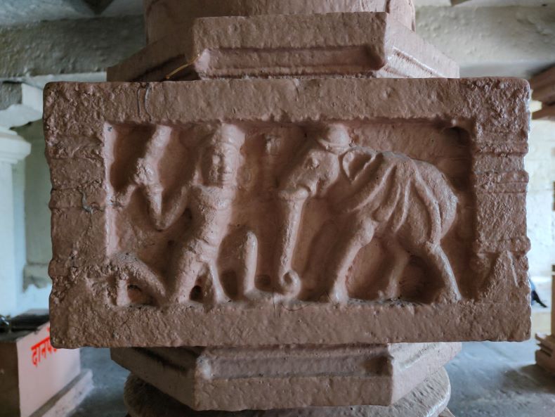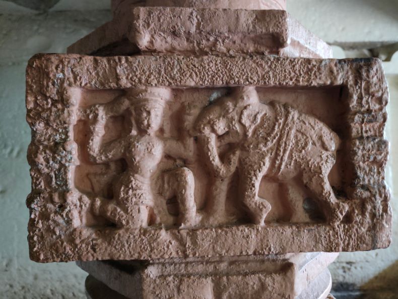 Sculptures in the gūḍhamaṇḍapa – Pillar 4: Elephant and Vyāḷa sculptures are carved on the central part of the pillar on the east. In the south, probably the killing of Kuvalayapīḍa is depicted.