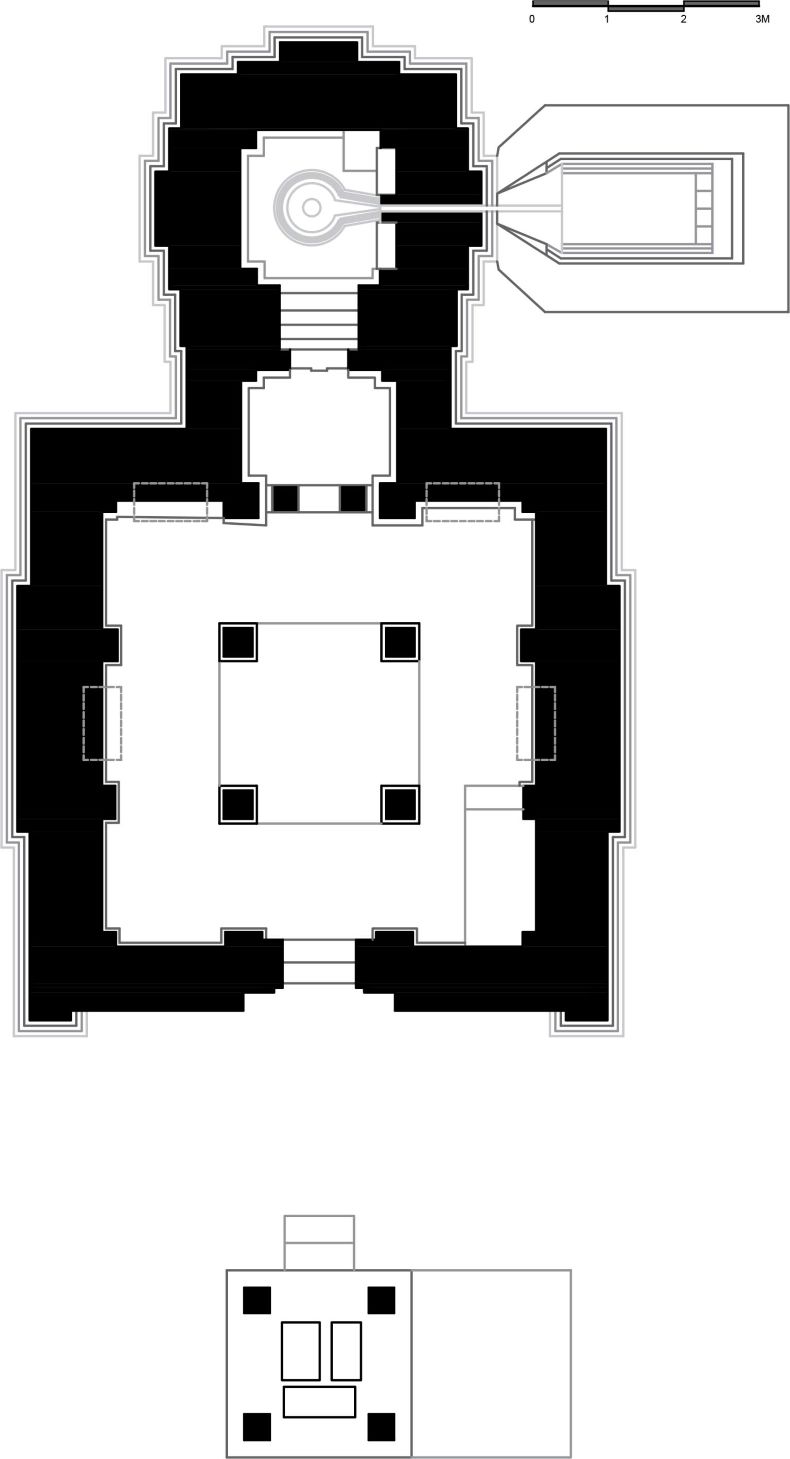 Below these sculptures, there are diamond bands on both sides. On the north and south sides of the entrance to the kakṣāsana, two male guardian figures are carved.