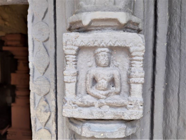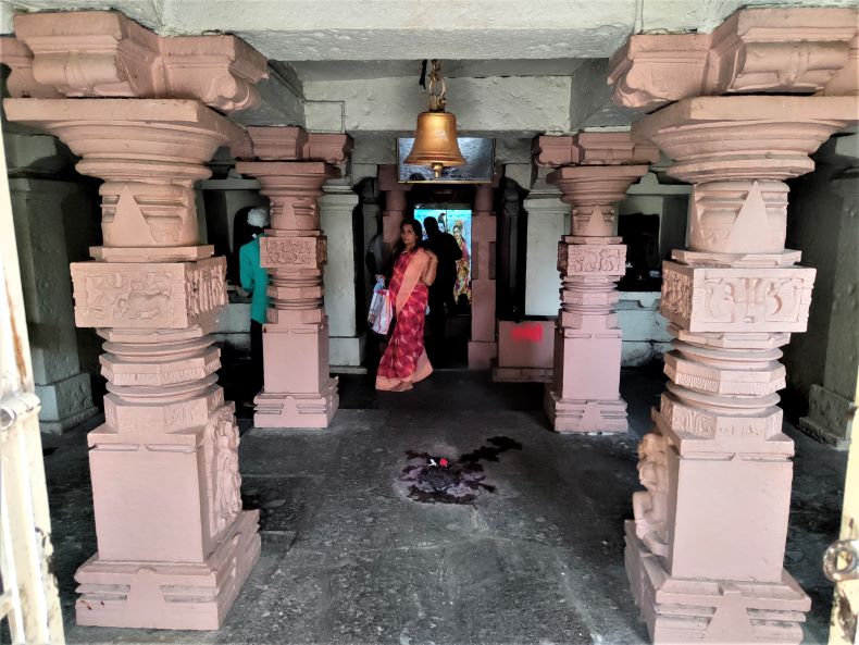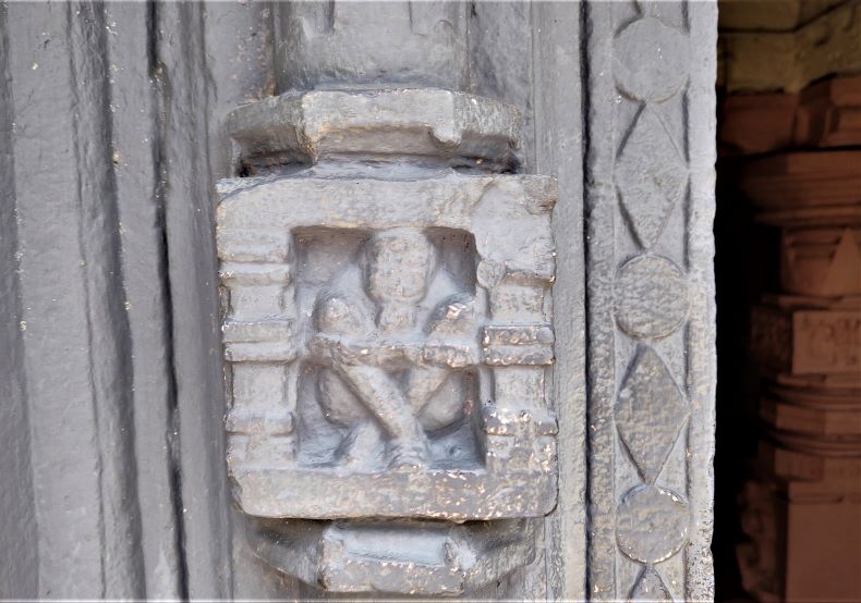 Gūḍhamaṇḍapa: The gūḍhamaṇḍapa has an ornate entrance in the east. The door-jamb consists of diamond, pillar, and plain sections/branches. Two yogīs are also carved on the stambhaśākhā of the door. Śaiva Dvārapāla, Nidhī, Gaṅgā , and Yamunā have been carved on the peḍyā of the door of gūḍhamaṇḍapa. There are two Nandī sculptures carved beside the Dvārapāla. The gūḍhamaṇḍapa is square in plan and it has two projections coming out on the outside in two corners. The kakṣāsana has two dwarf pillars (Vāmana pillars) ornated with sculptures. There are four main pillars and ten pilasters in the maṇḍapa. The four pillars balance four shafts and a ceiling whcih probably has a Gajāsura-vadha sculpture. The pillar structure is as follows: from bottom to top – square base, rectangular shaft, three octagonal rings and two round rings between them, pillar center, octagonal ring, oval top, round ring, square top, and capitals with cobra motif. The rectangular shafts bear Surasundarī sculptures, and the pillar center parts bear scenes from epics, sculptures of yogī, and warfare. The gūḍhamaṇḍapa has four aediculae: two near the antarāḷa passage walls and two in the right and left walls. These aediculae possess some sculptures from the Marāṭhā period. Of them, one sculpture seems to be of Keśava-Viṣṇu and appears old and broken.