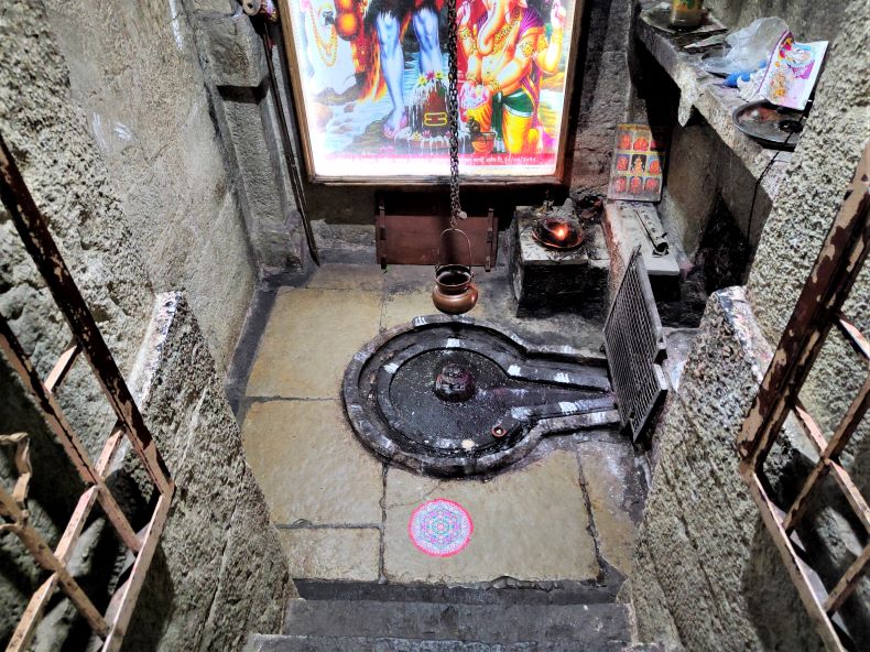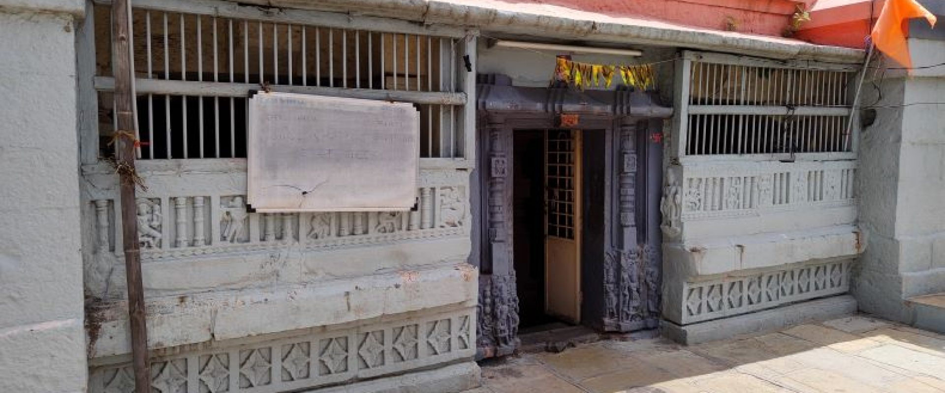 Exterior of the temple: The temple's exterior is plain, unornate only except for the facade. There are no aediculae or decorations on the walls. A stone vessel is fixed in the south wall to carry all the water for garbhagṛha. The water and other substances poured on the Śiva liṅga during abhiṣeka, are channeled out and collected in the basin (kuṇḍa) in the north. The superstructure of the temple was renovated in the year of 1995, so there is no way of knowing what the original śikhara looked like. Also, there are no signs of a fencing wall as of now. However, the temple complex is preceded by a large entrance. Probably this entrance was built in the Marāṭhā period. There is a simple lamp post on the temple premises.