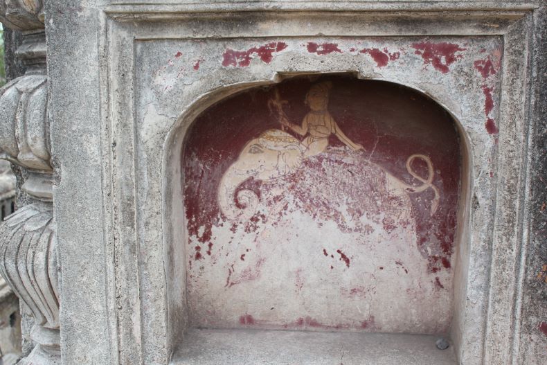 The next laghu-śikhara depicts a mahout sitting on an elephant with a goad, and a beautiful headgear on the elephant's head, probably of God Indra. The first among the small laghu-śikharas of the second layer shows an image of a woman seated in padmāsana wearing a sari and big ear ornaments. The next laghu-śikhara should have a colourful picture, but it has been eroded by sun, wind, and rain. Next is a beautiful replica of gavākṣa. After that, a person wearing a kurta of yellow and red lines with a unique cap on his head is seated with a leaning posture on his right, resembling an Englishman from his attire.