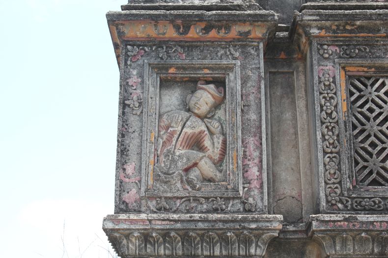 The second and third layers have replicas of five variably carved latticed windows and four human figures' sculptures. The second and third persons are standing with folded hands, and one of them is an image of Hanumāna. Between the second and third layers, four seated human figures can be seen, including a woman with her baby in the second layer.