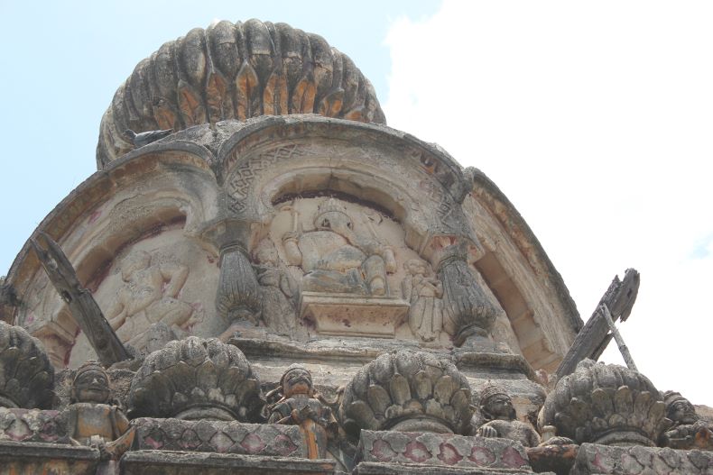 The eastern part of the śikhara: The eastern part of the śikhara features a sculpture of Viṣṇu in the first niche, with his mukuṭa and chakra visible. The niche next to it depicts a combat between two warriors, one with a sword, and the other with a paraśu. There is an entrance ahead, small enough for a person to penetrate the inner cavity of the śikhara. Probably an ascetic should be sitting there in samādhī. The next niche shows a picture of a yogī turning to his right, sitting in padmāsana and dhyānamudrā, with his eyes open, wearing a turban-like cap and large kuṇḍalas in his ears, likely a Nātha-Yogī.