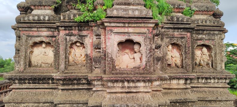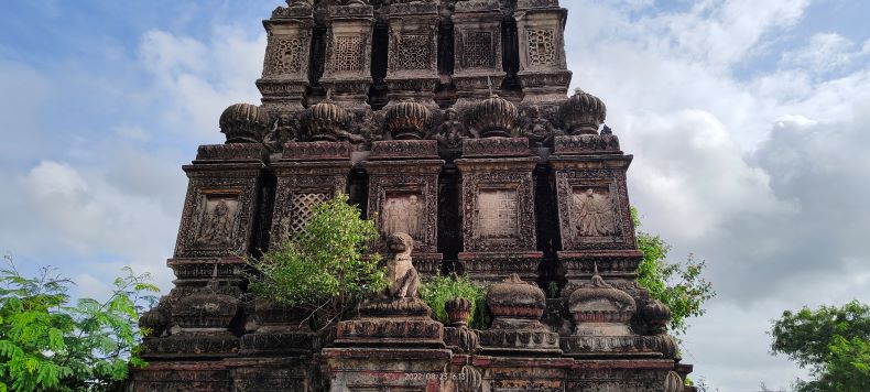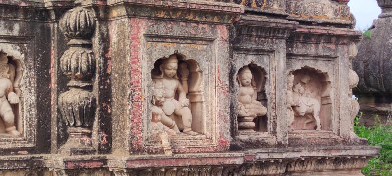 The śikhara of the temple: The Siddheśvara temple boasts a magnificent śikhara built in the fresco style using bricks and lime. The square-shaped śikhara has three layers of small śikharas and arches on all sides under the āmalaka. Adorned with images of gods, goddesses, yogīs, humans, and various latticed windows, the lowest level has five small śikharas in each direction, with images inside, except for the central part's eastern side. The central part has a small śikhara that is slightly ahead, containing images of Nandī in different directions, except for the east.