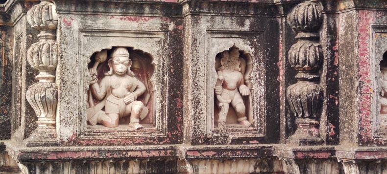 The southern part of the śikhara: In the first laghu-śikhara of the first layer, a horseman stands holding the reins of a horse. A sculpture of a four-handed goddess follows, then a four-handed deity holding a person's śikha with one hand. After that, there is a fragmentary sculpture of Garuḍa in a standing position, followed by a well-preserved sculpture of Hanumāna holding a mace in his right hand while his left-hand rests on his waist. A vīṇādhārī woman with an animal is seen in the second layer, as well as a latticed window, a seated human figure, and probably a sculpture of Śrī Kriṣṇa holding a nāga with his lower two hands. A person is seated with a child or a woman on his lap between the second and third layers, with a couple standing next to them. In the third layer, there are replicas of five latticed windows, and below that, there are images of four seated figures.