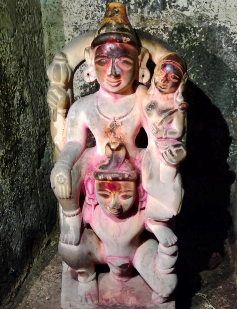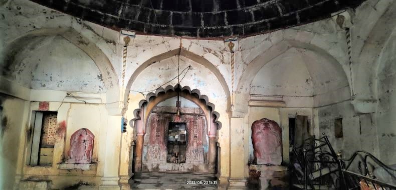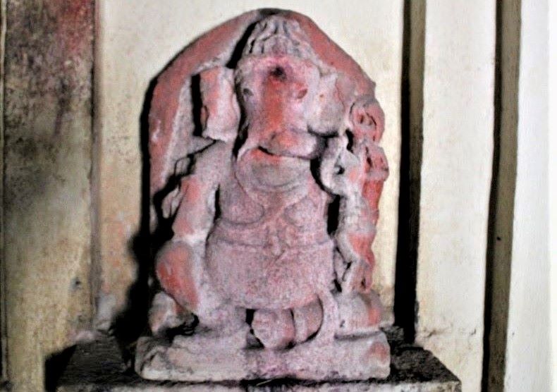 Next, we enter the gūḍhamaṇḍapa which is massive, measuring 627 cm in length and 620 cm in width. On all four walls of the gūḍhamaṇḍapa, there are arched structures, and the roof is dome-shaped and built of stone. The entrance of the gūḍhamaṇḍapa is carved and has a candraśiḷā in front of it. On the lalāṭapaṭṭa, there is a sculpture of Gaṇeśa, and above it, there is a row of bilvapatras. Inside the gūḍhamaṇḍapa, there are upa-garbhagṛhas on the north-west and south-west. The southwestern garbhagṛha has a Gaṇeśa sculpture on its lalāṭapaṭṭa and a four-handed image of goddess Kālikā inside. A big image of Gaṇeśa is kept outside this upa-garbhagṛha. The upa-garbhagṛha in the northwest is currently locked and has junk objects inside.