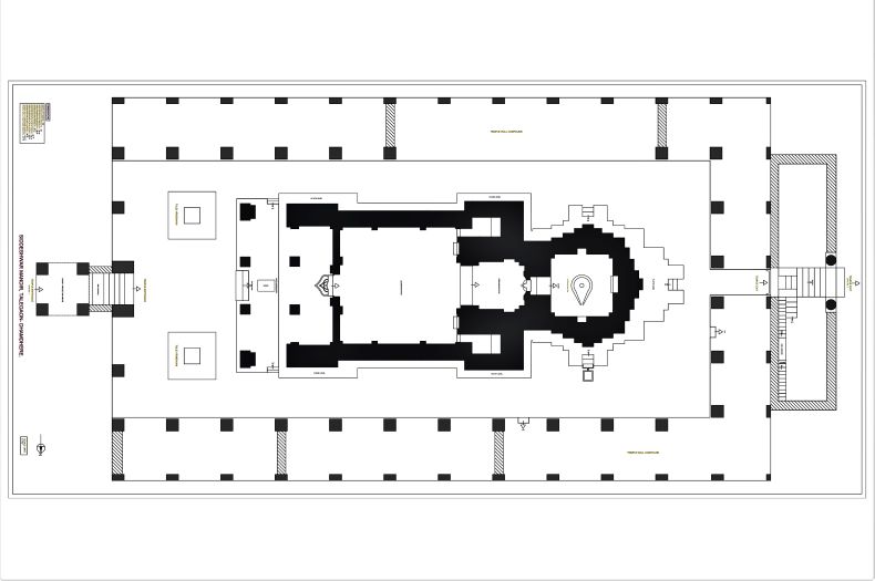 The main structure of the temple: As we enter the temple complex from the east, we are greeted by twoTulasī vriṅdāvanas, each measuring 255 X 255 cm. These vriṅdāvanas are adorned with composite sculptures of elephants, Nandī, and birds. Moving on, we come across the nandīmaṇḍapa which is connected to the mukhamaṇḍapa via steps. The nandīmaṇḍapa, with a length of 228 cm and a width of 934 cm, has a flat roof supported by two unsculptured pillars. The left and right ends of the roof are lined with wooden planks while the middle portion has plain stone slabs. The facade of the nandīmaṇḍapa boasts three arches and two unsculptured pillars.