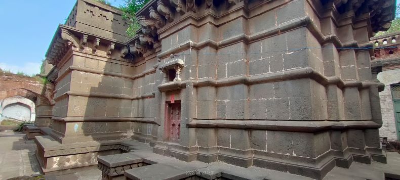The temple stands on a raised sub-platform with two small gavākṣa or latticed windows outside the gūḍhamaṇḍapa for lighting. There is a praṇālaka to the north of the garbhagṛha to carry the internal water. The stone carved doors on three sides of the garbhagṛha are a characteristic feature of the Marāṭhā style and have small śikharas on top. The antarāḷa and gūḍhamaṇḍapa also have small śikharas. The onion-shaped portion of āmalaka on the śikhara of antarāḷa is still intact, but the part on the gūḍhamaṇḍapa has been damaged.