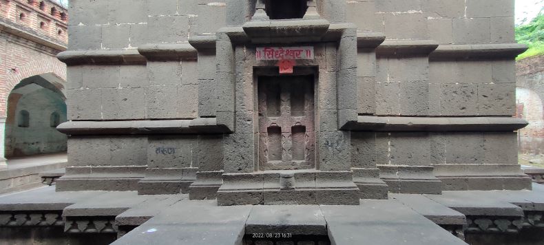 One of the most notable temples in Talegaon is the Siddheśvara Temple. This grand and massive temple is located in the main settlement of the village and is easily accessible. It faces east and is flanked by the Gaṇapatī and Kākaḍeśvara temples to the east, while the Kāśī-Viśveśvara and Śrinātha temples are located at a distance to the north. The Siddheśvara temple is surrounded by a tall and magnificent fencing wall that has two entrances, one from the east and one from the west. The eastern entrance is the main one and is larger. Upon entering, one must climb some steps and will see a distinguishing maṇḍapa, which may have been used as a nandīmaṇḍapa due to its architecture and space for a Nandī in the centre.