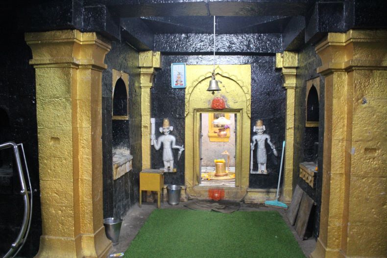 Two sub-garbhagṛhas flank the main sabhāmaṇḍapa, each containing ancient Śivaliṅgas. The maṇḍapa's ceiling is unadorned, contributing to the hall's austere ambiance. The antarāla features two shrines and leads to the garbhagṛha through an unembellished doorway guarded by figures on both sides. Carvings of Gaṇeśa adorn the lintel, while Kīrtimukha motifs grace the threshold. Inside the garbhagṛha, a Śivaliṅga shrouded in a brass plate takes prominence, alongside a stone sculpture of a goddess, likely Pārvatī, with additional niches within the interior. The temple's exterior is modest, with simple carvings above the outer walls and interspersed between the spires. The spire itself is plain, featuring some niches on its initial tier. A small shrine, accompanied by four lamp pillars, sits to the right of the temple entrance. Within the temple grounds, visitors can discover a hero stone, a Hanumāna sculpture, and a Datta temple, as well as engravings of Garuḍa, Hanumāna, and Gaṇeśa on a stone slab.