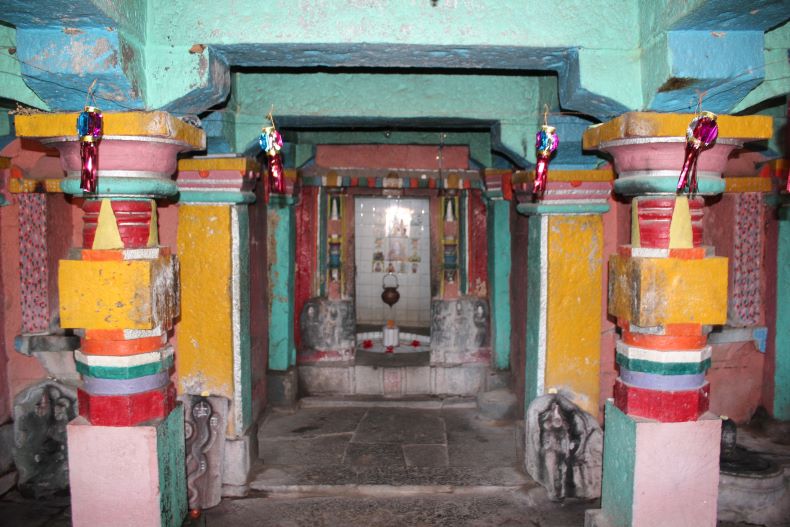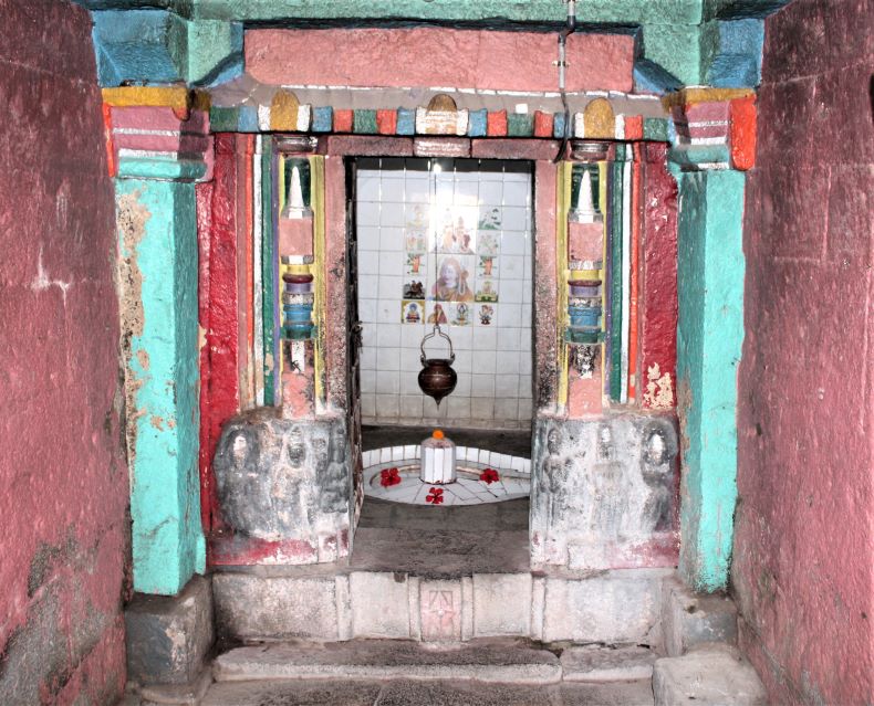 Proceeding further, the antarāḷa measures 205 cm by 196 cm, leading into the garbhagṛha. The latter, measuring 204 cm by 195 cm, features a doorway adorned with three dvāraśākhās. Below these, sculptures of Śaiva dvārapālas, nidhīs, and river figures can be observed. The śivaliṅga occupies the central position in the garbhagṛha. Modern interventions are evident as tiles have been laid in the garbhagṛha, incomprehensibly even on the śivaliṅga, which reflects a huge disconnect between the temple's Yādava heritage and modern renovations.