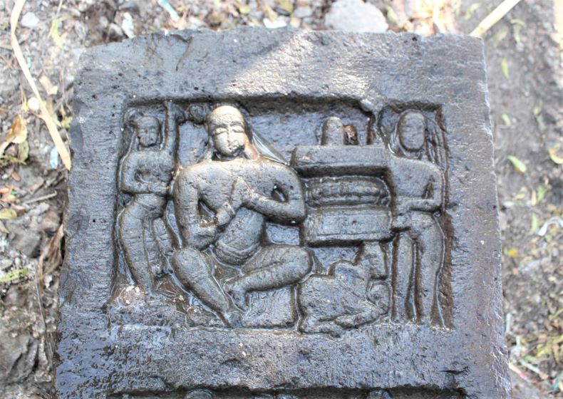 Gaṇeśa sculpture: The Gaṇeśa sculpture at this place (75 cm tall) can be said to be one of the Pune district's masterpieces. It is complete, and a broken tooth, paraśu, paśa, and a plate full of modakas are in his hands. Gaṇeśa is sitting in lalitāsana and has nāgabandha on his belly.